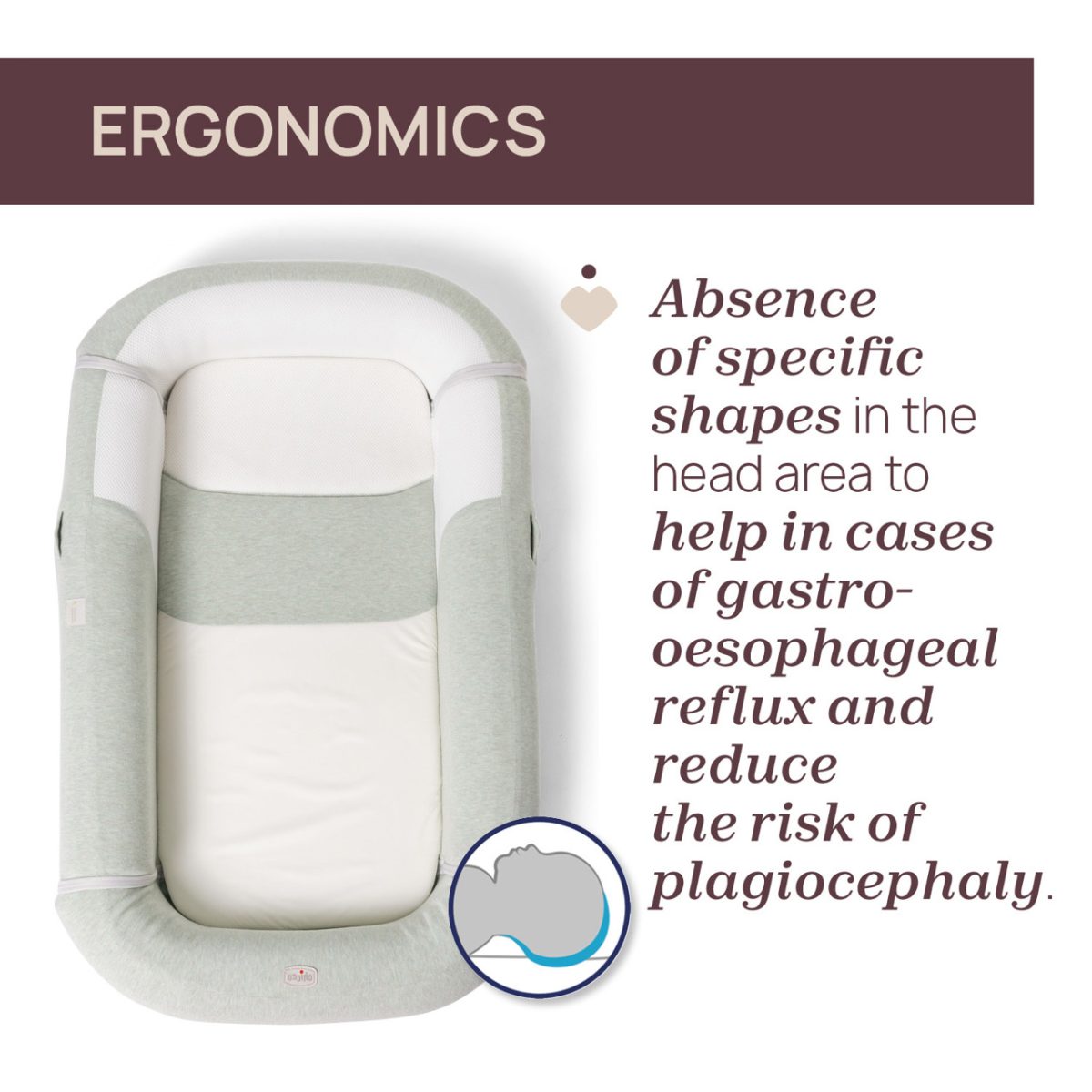 • Solução ergonómica: a ausência de formas específicas na área da cabeça permite que a cabeça se mova livremente, o que é essencial em casos de refluxo gastroesofágico e reduz o risco de plagiocefalia.