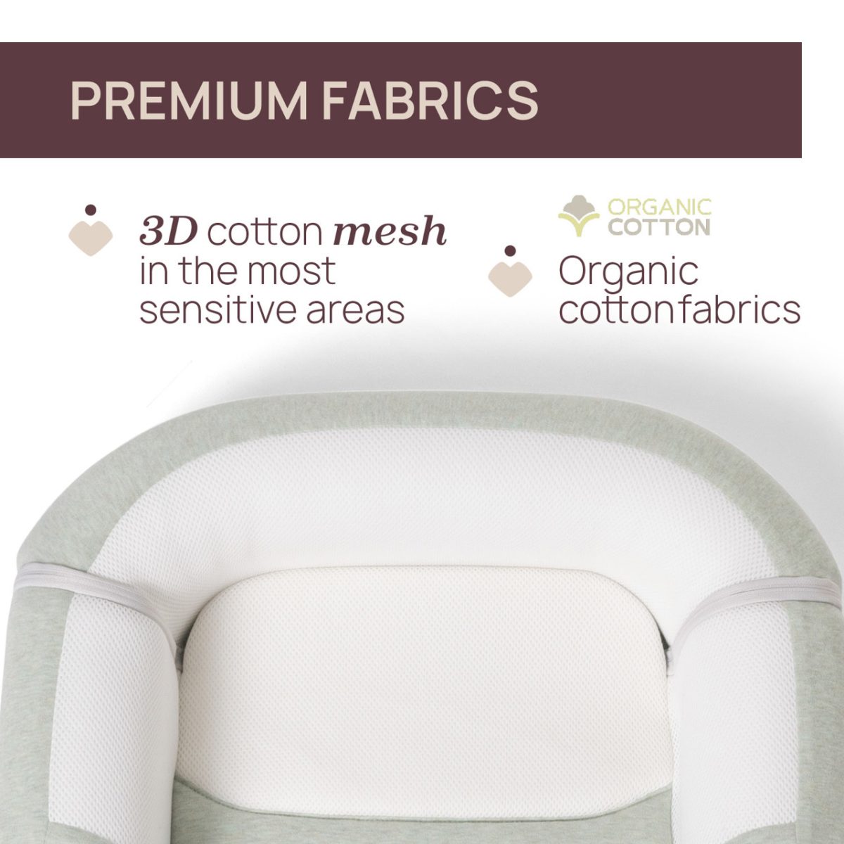 • Malha de algodão 3D nas áreas mais sensíveis para evitar o sobreaquecimento e proporcionar ao bebé um ambiente de sono confortável.